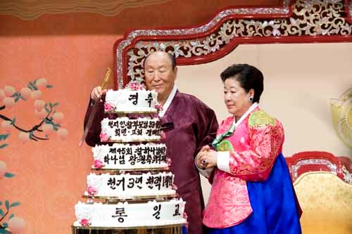 True Parents, who entered the room at 5:00 a.m. with Hyung-jin nim and his wife, cut the celebration cake and received flower bouquets from the members.