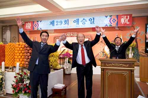 Father then asked Rev. Tae Geun Yoon to give a testimony. Rev. Yoon expressed gratitude to True Father for blessing him and to God for his two daughters. He proudly reported that both daughters received the blessing and that one of them gave birth to a child.
