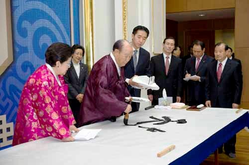 Seven Japanese members who took part in the 40-day workshop in Yeosu came up to sing the song they learned at the workshop. Under Dr. Chung Hwan Kwak's lead all participants sang 'Daehan Jiriga.'