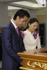 We pray deeply pray, Father, that Hyung-Jin Moon and Yeon-Ah Lee become a united couple and the successors of the True Parenthood, through which You can feel the greatest happiness. You couldn't bless your fallen children in the Garden of Eden. We pray and wish that this couple may connect the current epoch with the time of the Heavenly Ideal World, where You are liberated totally and solely You are reigning.