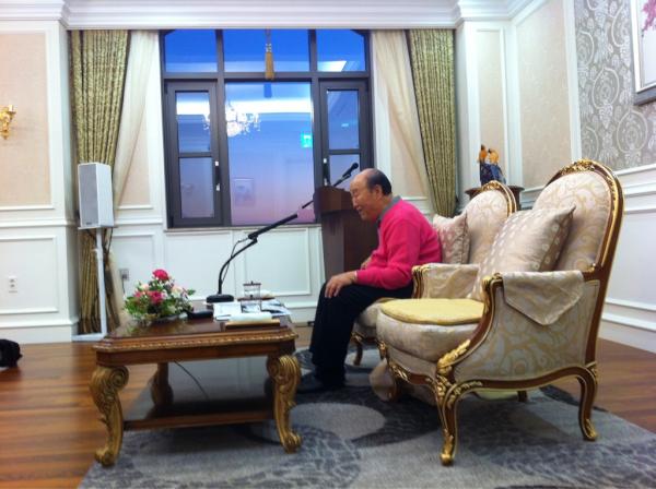 (Reading his calligraphy hung on the wall) "'천지인참부모정착 실체말씀 선포 / The Proclamation for the Settlement of the True Parents of Heaven, Earth, and Humankind and the Substantial Word of God.' Before this, I had a calligraphy '천지보모 천주 안식권 / The Realm (or Authority) of Safe Settlement of The Parents of Heaven and Earth.' In Las Vegas, I have a calligraphy '天情父母 地和子女 定着終最 一體完了 天宙定着 天一國萬歲.' (Katsumi: This became our motto of 2011. I attached a sheet that shows what the calligraphy looks like and my translation of the writing) After 一體完了, what will be the next program? We will enter the era of direct dominion by the Messiah of the Second Coming. It is the era of direct dominion by True Parents. If you go against the law in the era, there will be no forgiveness. In the era of the providence of salvation in the past, repentance and forgiveness applied, but after the proclamation by True Parents, a direct method will apply and the result will be only one of two in each case, such as either your being taken away or obtaining, receiving an award or dying, or resurrecting and flying or being buried in the soil."
