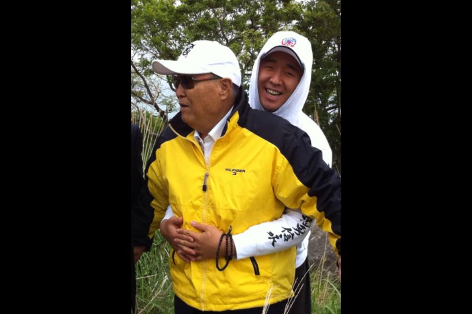 (@lovintp in English) A father with his youngest son, both wearing Tongilgyo caps.