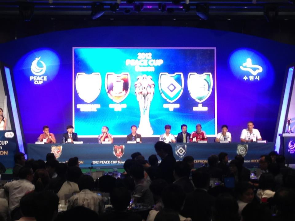 (from @peacecup) The news conference by teams participating in the 2012 Peace Cup was held Wednesday. The tournament begins Thursday in Suwon. True Parents are expected to preside over the opening ceremony.