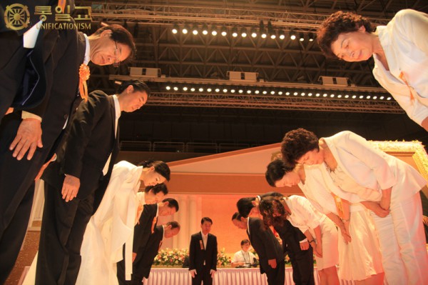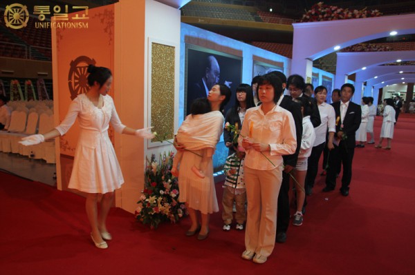 順番になれば花を受け取って真のお父様の肖像がかかっているトンネルを通って焼香所前に移動をする。