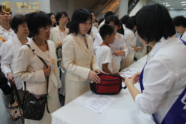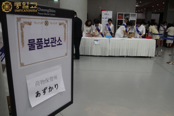 清心平和ワールドセンターに入る進入路から、長く並んだ参拝客らの目は参拝をするための最初の関門だ。順番を待って清心ワールドセンターの入り口に入ると参拝ガイドとリボンを受け右胸に着用する。