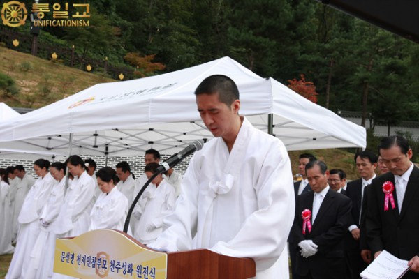 ソクチュノ韓国会長は「今日、私たちは人類の歴史にまたとない真に厳粛な瞬間に立ち会いました。全てを勝利され神様の実体になられた真のお父様は天 の国に入城された、実に天宙的な原殿式を迎えました。」と語り、「原殿式を通して真のお父様を霊界に送って差し上げた後にもいつも共におられると確信し、 変わる事のない場所で地上にいらっしゃる真のお母様に侍り、天地人真の父母様に忠と孝の生き方を決意し、これから文鮮明天地人真の父母 天宙聖和原殿式を始めます。」と文鮮明真の父母 天宙聖和原殿式の開会を宣言された。
