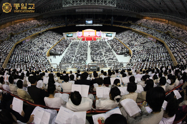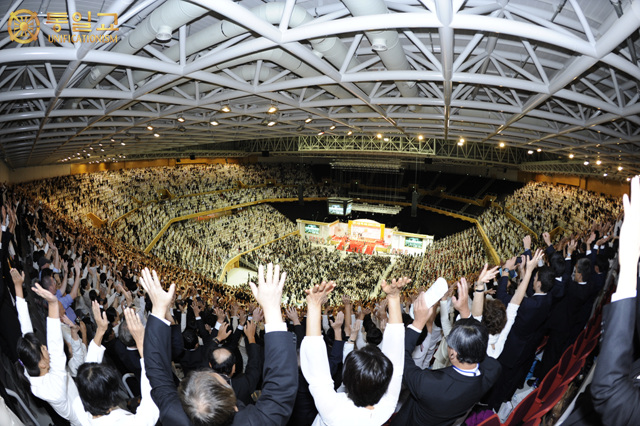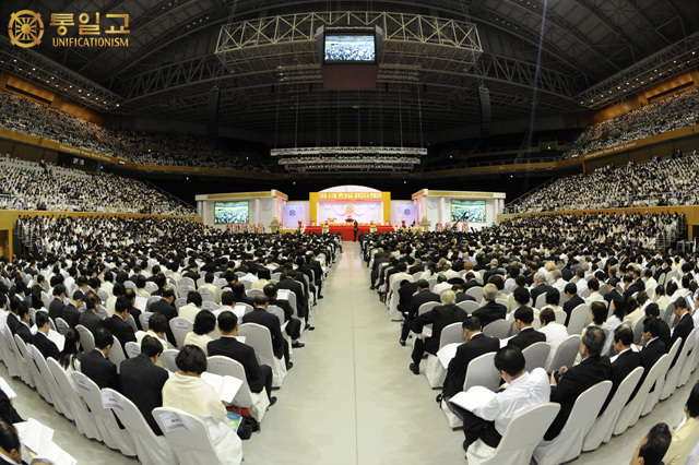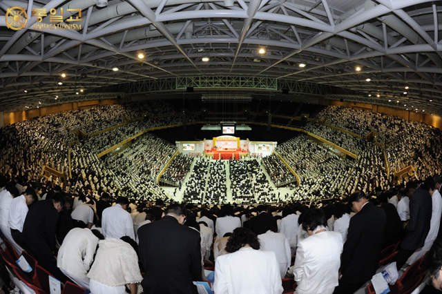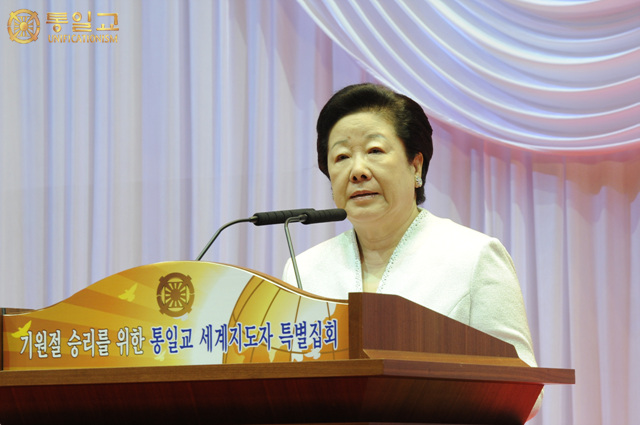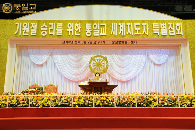 'World Unification Church Leaders Special Meeting for Victory on Foundation Day' took place on 8.2 by the Heavenly Calendar in the third year of Cheonggi (9.7 by the Gregorian calendar) at Cheong Shim Peace World Center. On this day, around 20,000 unification members from across the world assembled for the special rally. The MC on this day was Dr. Jun Ho Seuk, the Vice-President of Unificationism and the order of the event went as follows: Singing of the Cheon Il Guk National Anthem, a report prayer, a video presentation, welcoming remarks and introduction of True Mother, offering of flowers, True Mother's special address, and finally three cheers of Eok Mansei.