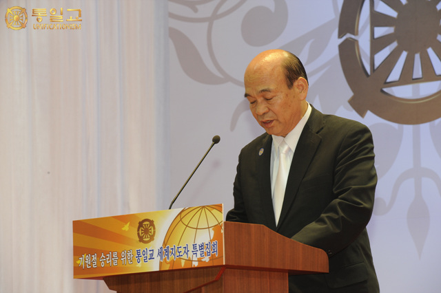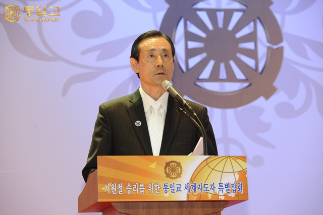 True Mother entered the venue amidst huge ovation and hearty cheers from all members. Soon after the entrance, all participants offered bows to True Mother, the True Parent. 'World Unification Church Leaders Special Meeting for Victory on Foundation Day' commenced with the opening declaration by Vice-President Dr. Jun Ho Seuk and was followed by the Cheon Il Guk National Anthem, and then a report prayer by the President of Unificationism-Japan Yeong Seop Song.