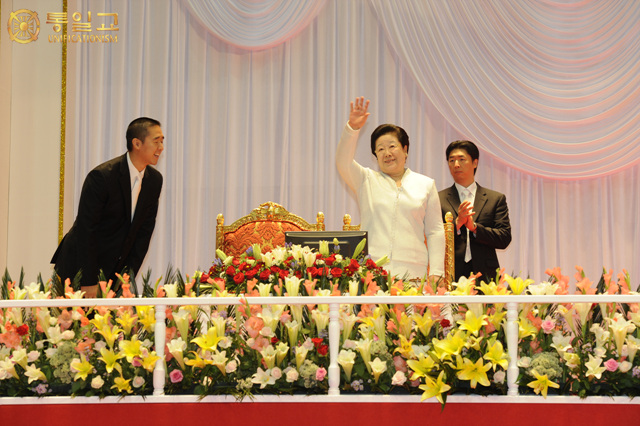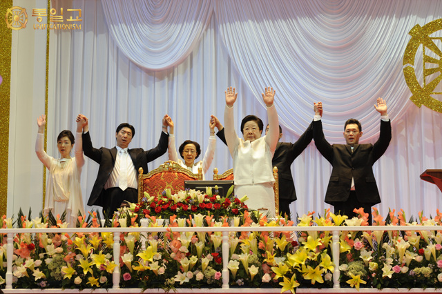 <True Mother and True Family joining in the three cheers of Eok Mansei>
