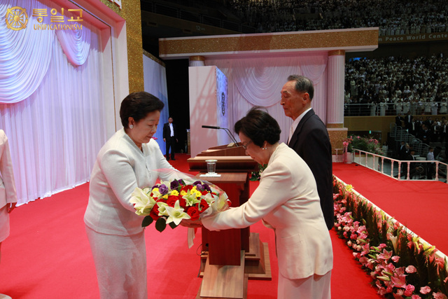 Next, representing all the members, Chairman Yong Hi Kim and Kuboki Dechiko presented bouquets of flowers to True Mother.