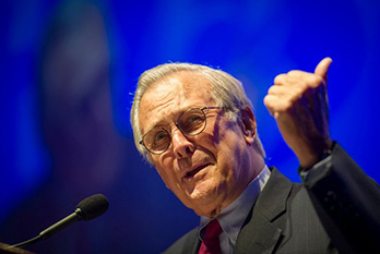 Donald Rumsfeld, former Secretary of Defense under the Administration of George W. Bush, gave a thought-provoking keynote address that brought new light to and questioned the policies of the Obama administration: