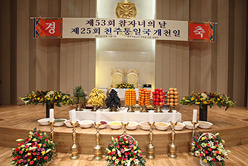 At 7 a.m., Korea time, Unificationists in Korea gathered at the main auditorium of the Cheong Bok Goong to celebrate the two Holy days. A magnificent offering table had been prepared on the main stage. The celebration began with opening remarks by Rev. Sung Bok Hong, who served as the emcee. Participants sang the Cheon Il Guk (God’s Heavenly Kingdom) anthem. Offering bows were then made by members of different categories representing the Second Generation family, the three main providential countries (Korea, Japan, and USA), the six continents, religions of Christianity, Buddhism, and Islam, Bun bong wang (National Messiah), clansmen, Cain and Abel, and the Spirit World. Afterwards, Rev. Jung Ok Yu offered a prayer. Dr. Joon Ho Seuk, president of church in Korea, cut the ceremonial cake, gave a speech explaining the significance of holidays, and then offered the benediction. The ceremony came to a close with three cheers.