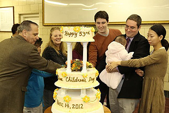 As the ceremony concluded, brothers and sisters in the congregation shared the celebration cake and divided the fruits and other offerings from the beautifully prepared offering table among all the families in attendance. Rev. Hyung Jin Moon, U.S. church president, and his wife Rev. Yeon Ah Moon and Dr. Chang Shik Yang, Continental Director were also present and took time to greet many of the families as they left to carry on their daily work.