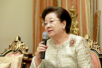 (From left) Rev. In Young Song, Rev. Seung Bae Ma, Dr. Jun Ho Seok, True Mother, Rev. Mu Sang Im, and an unidentified minister.