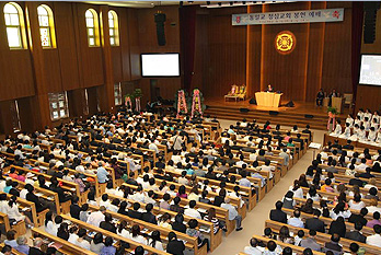 On May 13, 2012, the Korean Unification Church dedicated the newly-constructed Cheong Shim Unification Church (CSUC) in Cheong Pyeong. It was built to serve staff members of the many church-affiliated facilities in the Cheong Pyeong area, including Cheong Pyeong Heaven and Earth Training Center, Cheon Jeong Gung Museum, Cheong Shim Hospital, Cheongshim Youth Center, Cheong Shim Graduate School of Theology and more. More than 1,000 guests were present at the dedication ceremony, including Dr. Jun Ho Seuk, president of the Korean Church, Hoon Mo Nim, also known as “Dae Mo Nim” and the leader in charge of the Cheong Pyeong providence, Rev. Peter Kim and others.During his gratitude address, Dr. Seuk explained that the time period until Foundation Day (1.13 by the Heavenly Calendar) is a repeat of the indemnity course at the time of the March 1st Independence Movement in Korea, which was for the sake of True Parents’ incarnation. He said that Foundation Day, which is only ten months away, will be a day of the liberation of our Fatherland and the day that Cheon Il Guk (Nation of Cosmic Peace and Unification) begins in substance. He entreated everyone present to begin a new March 1st Independence Movement.