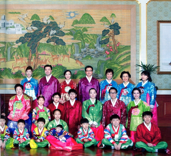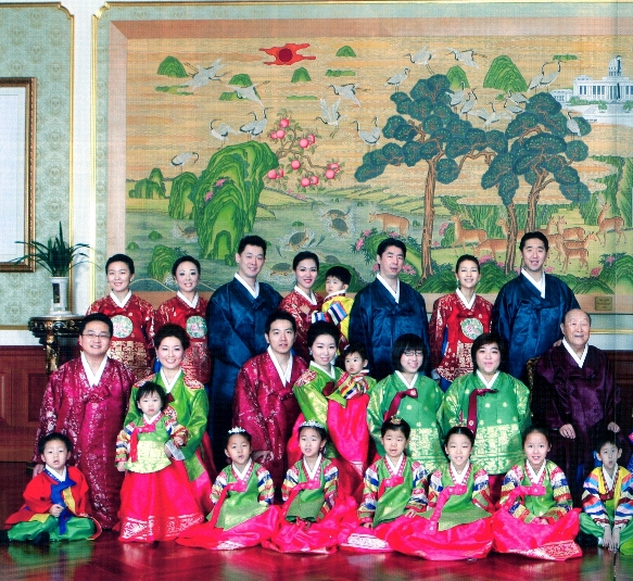 Center: Father and Mother; Standing, left to right: Yeon Ah Nim (Hyo Jin Nim's wife), Hwa Yun Nim (Kwon Jin Nim's wife), Kwon Jin Nim, Ji Yea Nim (Kook Jin Nim's wife) holding second son Shin Cheon Nim, Kook Jin Nim, Yeon Ah Nim (Hyung Jin Nim's wife), Hyung Jin Nim, Sun Jin Nim, In Sup Nim Sun Jin Nim's husband), Hoon Sook Nim (Heung Jin Nim's wife), Jin Sung Nim (In Jin Nim's husband), Un Jin Nim, Ye Jin Nim, Jeong Jin Nim; Kneeling, middle, left to right: Lee Hyung Jin Nim (Shin Mi Nim's husband) with Soon Nam Nim and Shin Mi Nim holding Soon Ok Nim (Their children are True Parents' great-grandchildren), Hirotaka Nim (Shin Sook Nim's husband) and Shin Sook Nim (Sung Jin Nim's second daughter) holding her daughter Soon Mi Nim, Shin Ji Nim (Un Jin Nim's second daughter), Shin Yeon Nim (Un Jin Nim's first daughter), Shin Yuh Nim (Hyo Jin Nim's first daughter), Shin Man Nim (Hyung Jin Nim's second son), Shin Pal Nim (Hyung Jin Nim's first son), Ariana Shin Sun Nim (In Jin Nim's daughter), Preston Shin Pyung Nim (In Jin Nim's first son), Krista Un Jeung Nim (Shin Pyung Nim's wife); Sitting, front, left to right: Shin Soo Nim (Kook Jin Nim's third daughter), Shin Nae Nim (Kook Jin Nim's second daughter), Shin Soon Nim (Hyo Jin Nim's second daughter), Shin Whul Nim (Heung Jin Nim's daughter), Shin Goong Nim (Hyung Jin Nim's daughter), Shin Joon Nim (Hyung Jin Nim's third son), Shin Jin Nim (Hyo Jin Nim's third son), Shin Deuk Nim (Hyung Jin Nim's fourth son), Shin Ah Nim (Kook Jin Nim's first daughter) holding Shin Pyun Nim (Kook Jin Nim's third son), Shin Kook Nim (Kook Jin Nim's first son), Shin Heung Nim (Hyo Jin Nim's second son), Shin Chul Nim (Hyo Jin Nim's first son) (Hyo Jin Nim's children here are all with Choi Yeon Ah Nim.)