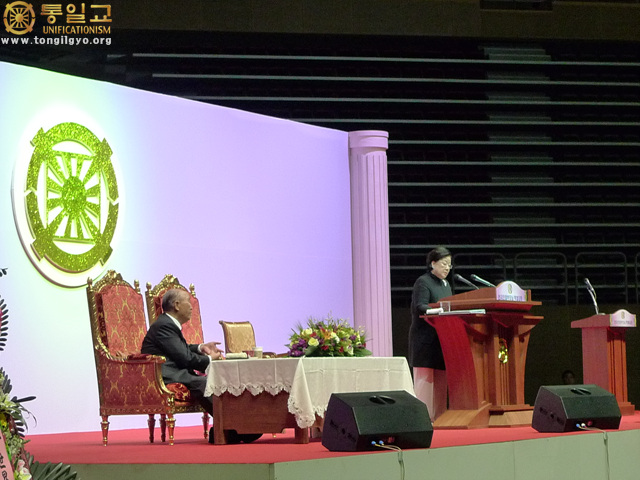 (Hyung Jin Nim and Rev. Sun Jo Hwang continued to stand on the stage beside Father.)