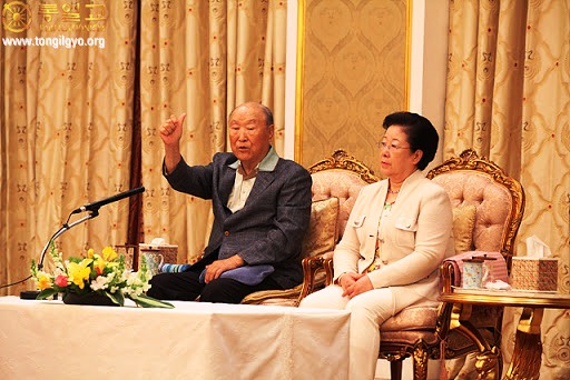 "There is the Cheon Jeong Gung in Chung Pyung, which by itself, brightens the fatherland. So the process of the dawn of the fatherland has already passed because we see, live and move in there. Therefore we can't say that we must try to have the dawn of the fatherland again. Cheon Jeong Gung itself has appeared like the lighthouse that symbolizes the victorious hegemony, which nobody in the world can deny. (This place won't disappear) even if someone explodes it. I will establish the ideal of the Cheon Jeong Gung in my hometown as well, which is the house of 80 million people (in the Korean peninsula.). This is my conclusion. Is that true or false? (To Mother) If you think that is true, raise your hand. (Mother raised her right hand) Applaud her. (Applause)"
