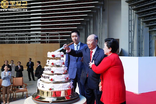After the cake cutting by True Parents and the presentation of bouquet flowers to them, Rev. Seuk gave his opening remarks. Everyone sang the Cheon Il Guk anthem and Rev. Yu offered a prayer.