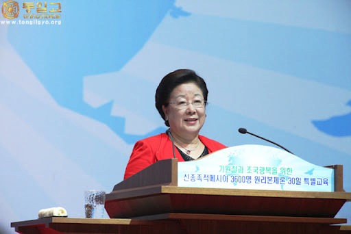 Before Mother read Father's speech, she said, "Thank you. Wishing the restoration of God's homeland, I will read True Parents' speech." During her reading, Father gave comments, and later Mrs. Nan Yeong Moon, the president of WFWP, shared her testimony.
