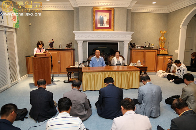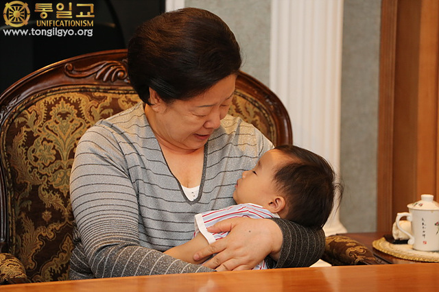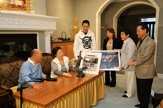 In Jin Nim, Hyung Jin Nim, and Rev. Yang presented True Parents large photos of the celebration of the 30th Blessing anniversary of 2075 Blessed Couples held in front of the Madison Square Garden, news coverage of the event, and their gift for True Parents (a statue of a couple of whale which are tossing their young). Father gave his autographs on the photos.