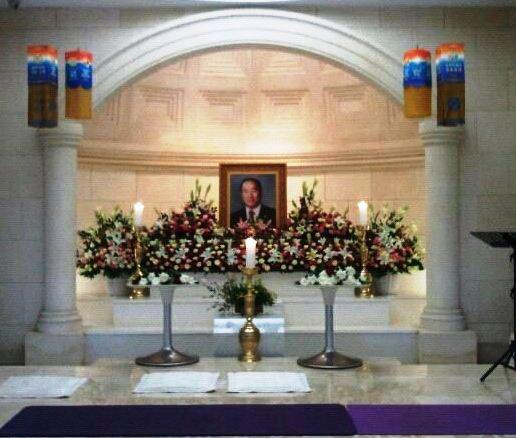 A flower arrangement with a ribbon showing the name of President Lee Myung Bak sits stage right.
