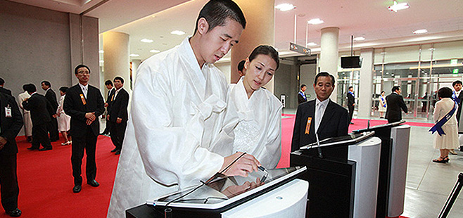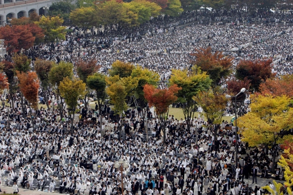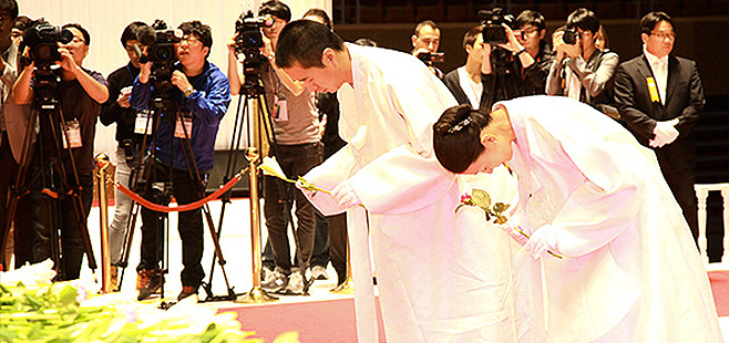 Thousands of the Membership, both old and young, arrive from around the world to Cheongshim World Center to offer devotion and a traditional gift of flowers.