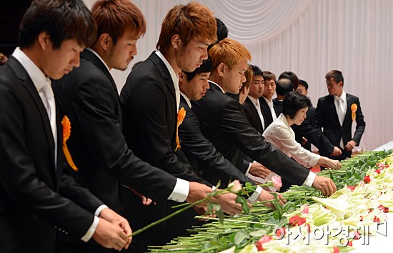 Numerous floral tributes expressing the condolences of various VIPs from Korea were on display in the shrine. Floral arrangements arrived from current heads of state, including President Lee Myung-bak, President Dioncounda Traore of Mali, President Johnson Toribiong of Palau and Prime Minister Ahoomey-Zunu of Togo, as well as former heads of state including former President Alfred Moisiu of Albania and former President Julio Maria Sanguinetti of Uruguay. Korean political leaders sending flowers included National Assembly Speaker Gang Chang-hee, Finance Minister Bahk Jae-wan, Unification Minister Ryu Woo-ik, Food, Agriculture, Forestry and Fisheries Minister Seo Gyu-ong, Floor Leader Lee Han-gu of Hannuri Party, and Chairperson Han Seon-gyo of Culture, Sports, Tourism and Broadcasting Committee.