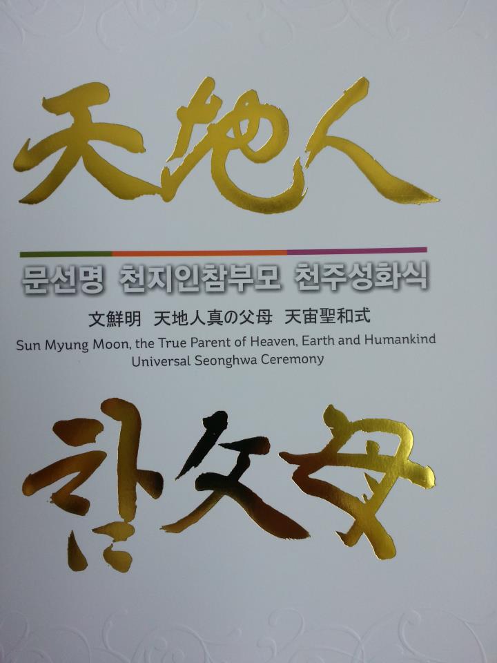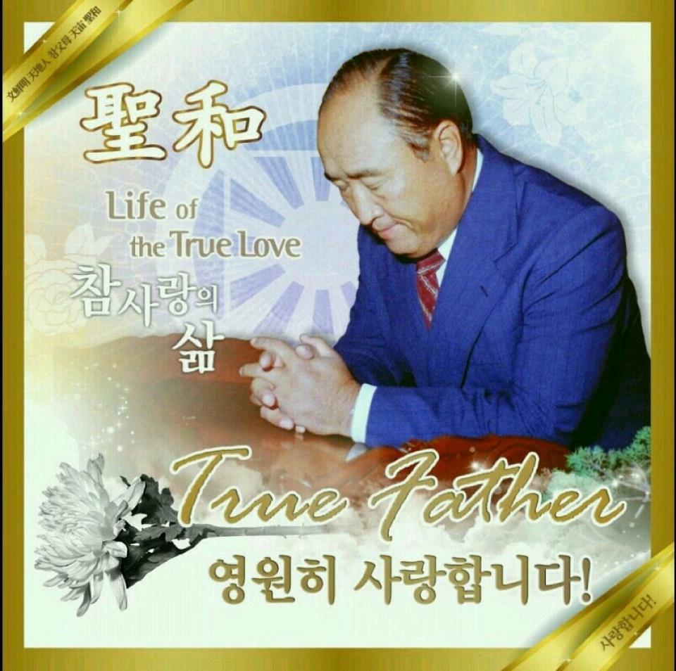 Our beloved True Father who came to this earth as the Savior of humankind, the Messiah, the True Parent and the King of Kings and who lived a holy life of true love throughout his 93 years, shedding blood, sweat and tears for God's liberation, the salvation of humankind and world peace, having concluded, completed and perfected his providential mission, ascended into the spirit world at 1:54 AM, 7.17 in the 3rd year of Cheon-gi - the heavenly calendar(September 3, 2012) at the Cheongshim International Medical Center. He was surrounded by True Mother and the True Children.