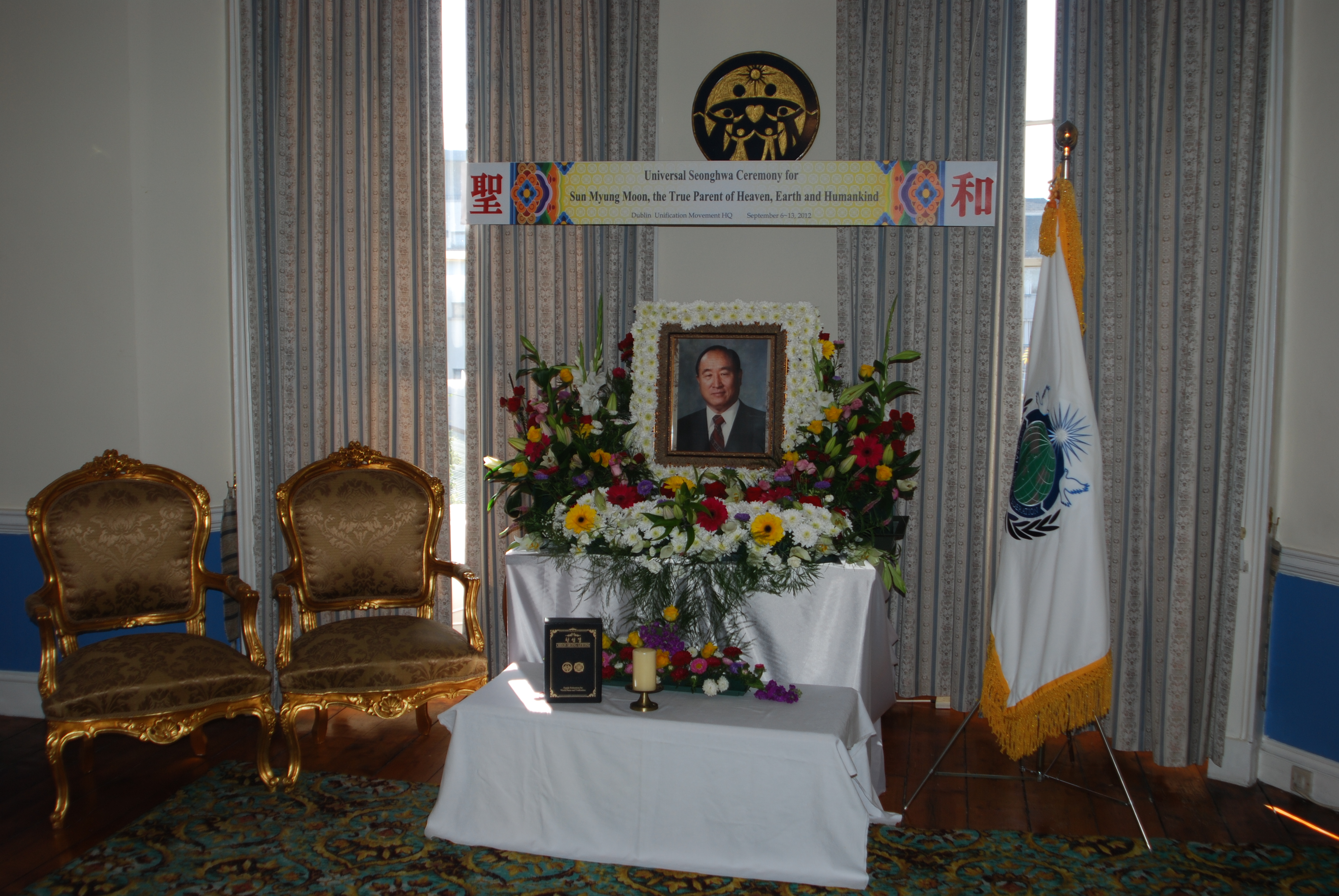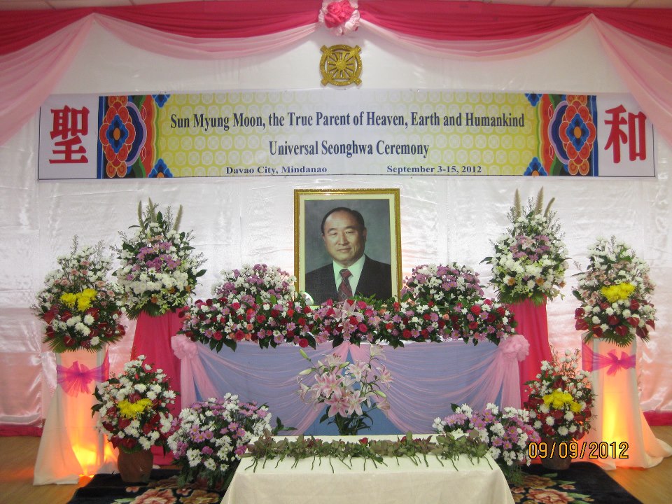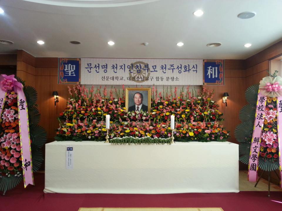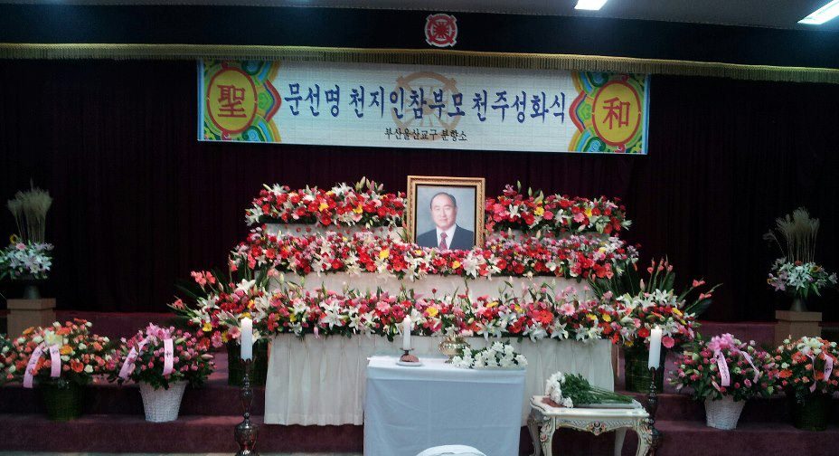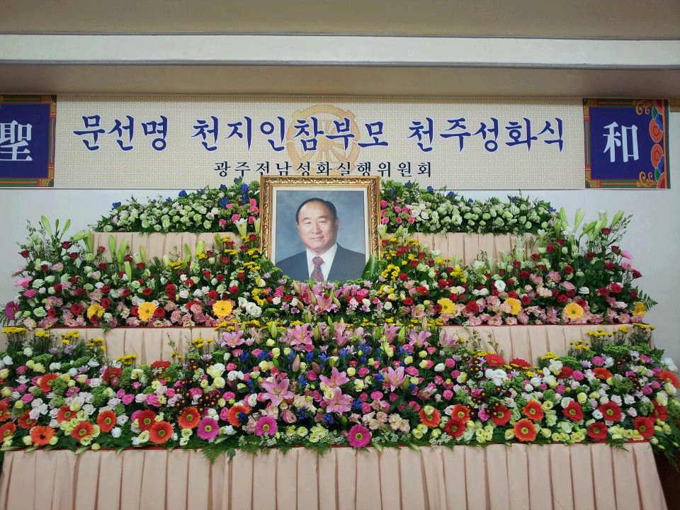 Wife: Hak Ja Han; Chairman of the Seong Hwa Ceremony: Hyung Jin Moon; Bereaved: Hyung Jin Moon, Kook Jin Moon, In Jin Moon, Sun Jin Moon, Yeon Ah Choi, Hoon Sook Moon, Yeon Ah Lee, In Sup Park, Sung Jin Moon, Ye Jin Moon, Un Jin Moon, Kwon Jin Moon, Yeon Jin Moon, Jung Jin Moon, Dong Sook Kim, Ji Yea Park, Hwa Yeon Jeon, Jin Sung Park, Shin Il Moon, Shin Mi Moon, Shin Man Moon, Shin Goong Moon, Shin Jun Moon, Shin Duk Moon, Christa, Hyung Jin Lee, Otsuka Hirotaka, Young Woong Kang, Soon Nam Lee, Soon Ok Lee, Otsuka Soon Mi, Shim Mi Kang, Shin Sook Moon, Shin Bok Moon, Shin Goon Moon, Shin Hwa Moon, Shin Choon Moon, Shin Chool Moon, Shin Heung Moon, Shin Nyo Moon, Shin Soon Moon, Shin Jin Moon, Shin Myung Park, Shin Kwon Park, Shin Sun Park, Shin Yeol Park, Shin Pyung Park, Shin Wol Moon, Shin Yeon Moon, Shin Ji Moon, Shin Ah Moon, Shin Rae Moon, Shin Soo Moon, Shin Gook Moon, Shin Cheon Moon, Shin Pyun Moon, Shin Joo Moon, Shin Pal Moon