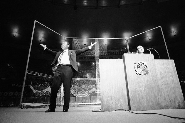 ![]() Rev. Moon Gives a Message to a Christianity in Crisis. The Rev. Sun Myung Moon gestures to capacity crowd of 2000 on Wednesday, Sept. 19, 1974 in New York's Madison Square Garden, where he preached for the rebirth of Christianity. His appearance was part of a 40-city U.S. tour this year. |