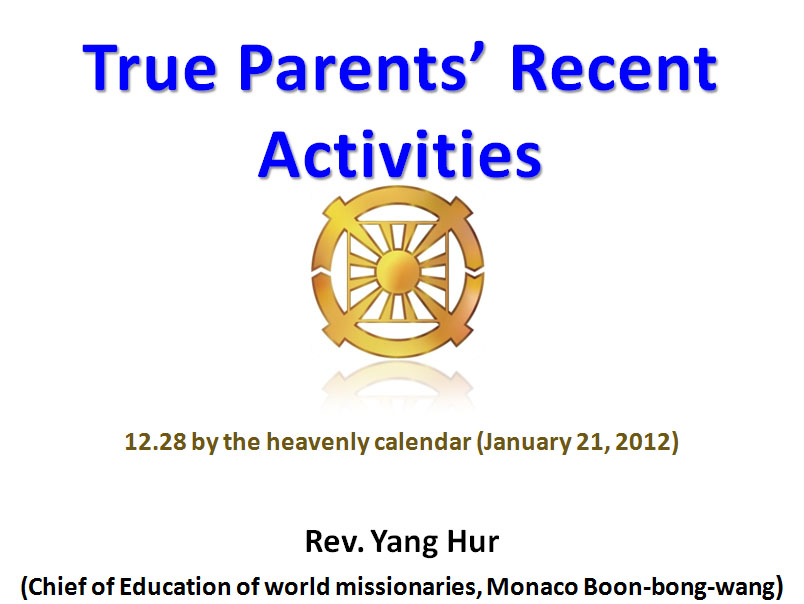 March 26, 2012 - True Father at King Garden, Kona USA Hoon Dok Hwe: The Abel UN hasn't been announced yet - True Mother Speaking to WFWP in Seoul, Korea |
