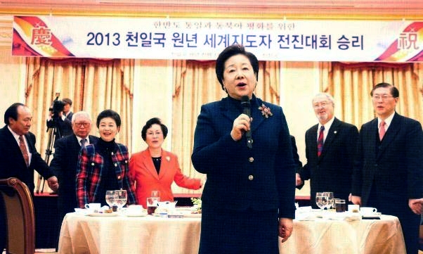 Distinguished guests that have gathered here today and particularly ambassadors of peace, please fulfill all of your responsibility on the front line. Heaven's providence does not wait for us. There is a right time. We are at an important point of time when we should be in the position of true and devoted children that attune themselves to this time. Rev. Sun Myung Moon has been educating people under the motto, Love God, love people and love your country.