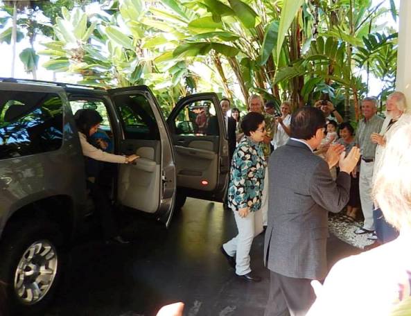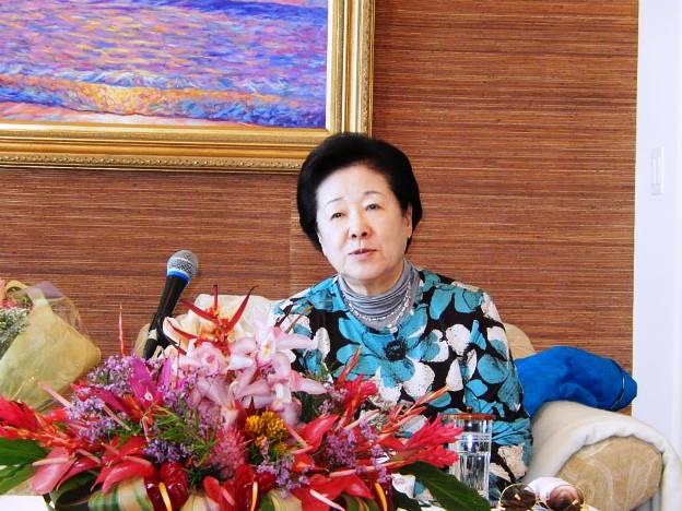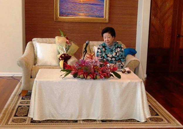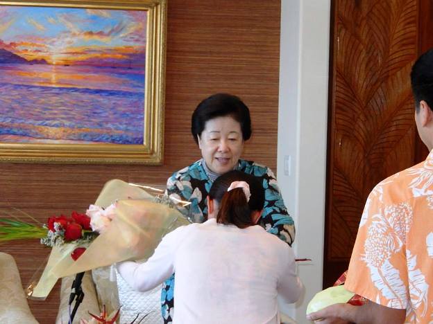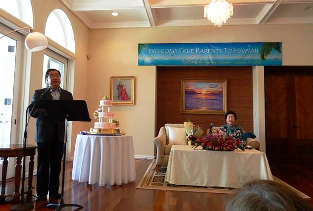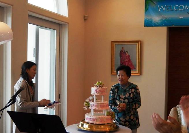 We offered a full bow and flower bouquets were offered by two second generation Japanese missionaries. Mother asked us to say "Aloha!" again and she said "Mahalo!" (Thank you). We sang "Welcome, True Parents, to Kona" two times to the tune of "Happy Birthday" while Mother blew out the candles and cut the cake. Then she was seated and began to speak.