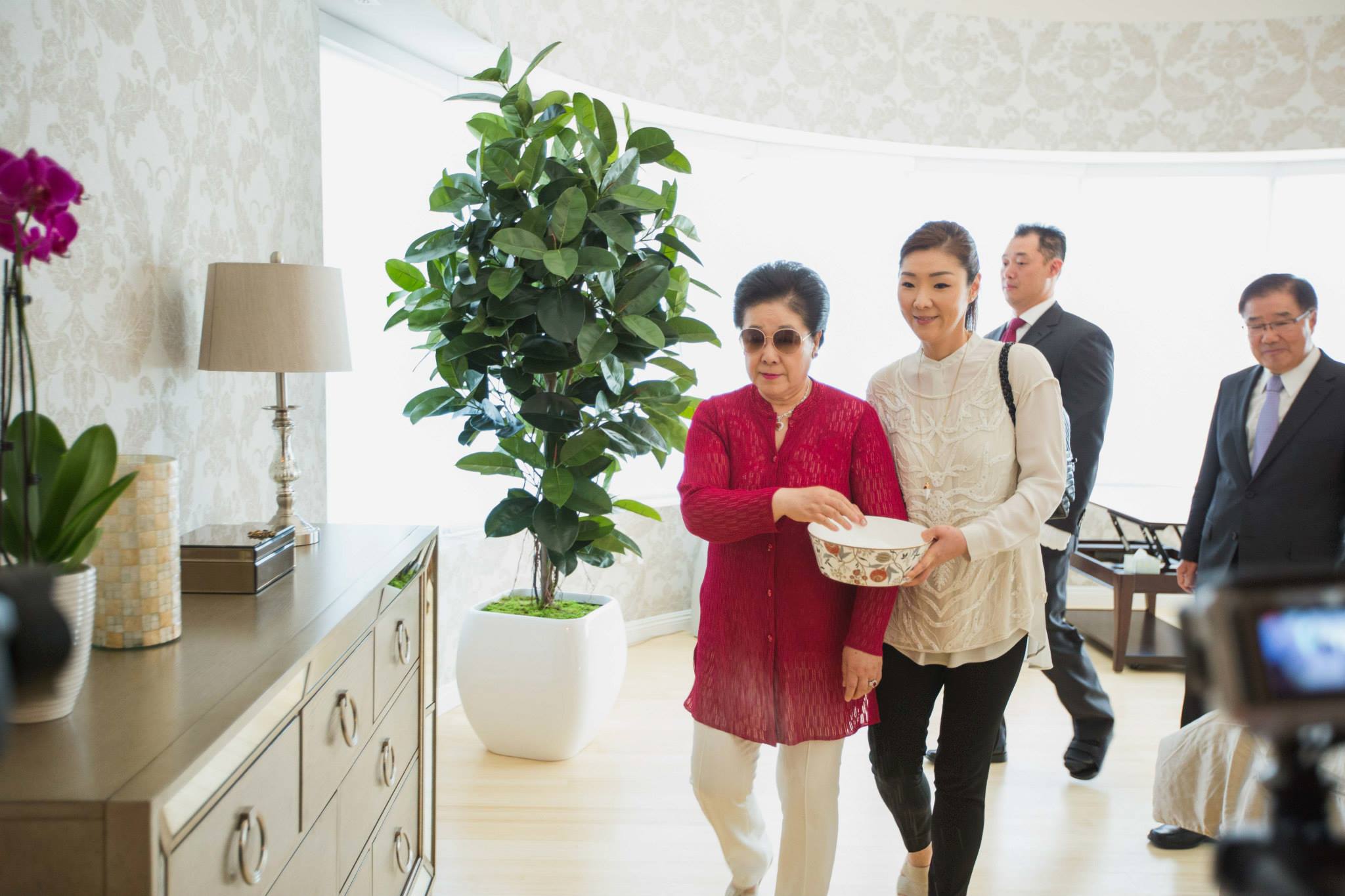 An entire stretch of wall displayed the names of donors from Japan in Japanese, and a lounge set off to the left served iced tea, coffee, water and a variety of hot teas. The energy was high, the atmosphere relaxed, with everyone excited to be there. Friends and groups spread out and took group photos inside and outside of the building. Everyone was happy be able to say, “I attended True Parents on this important occasion.”