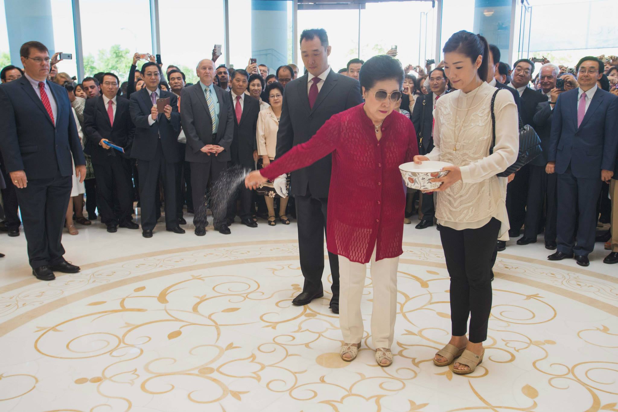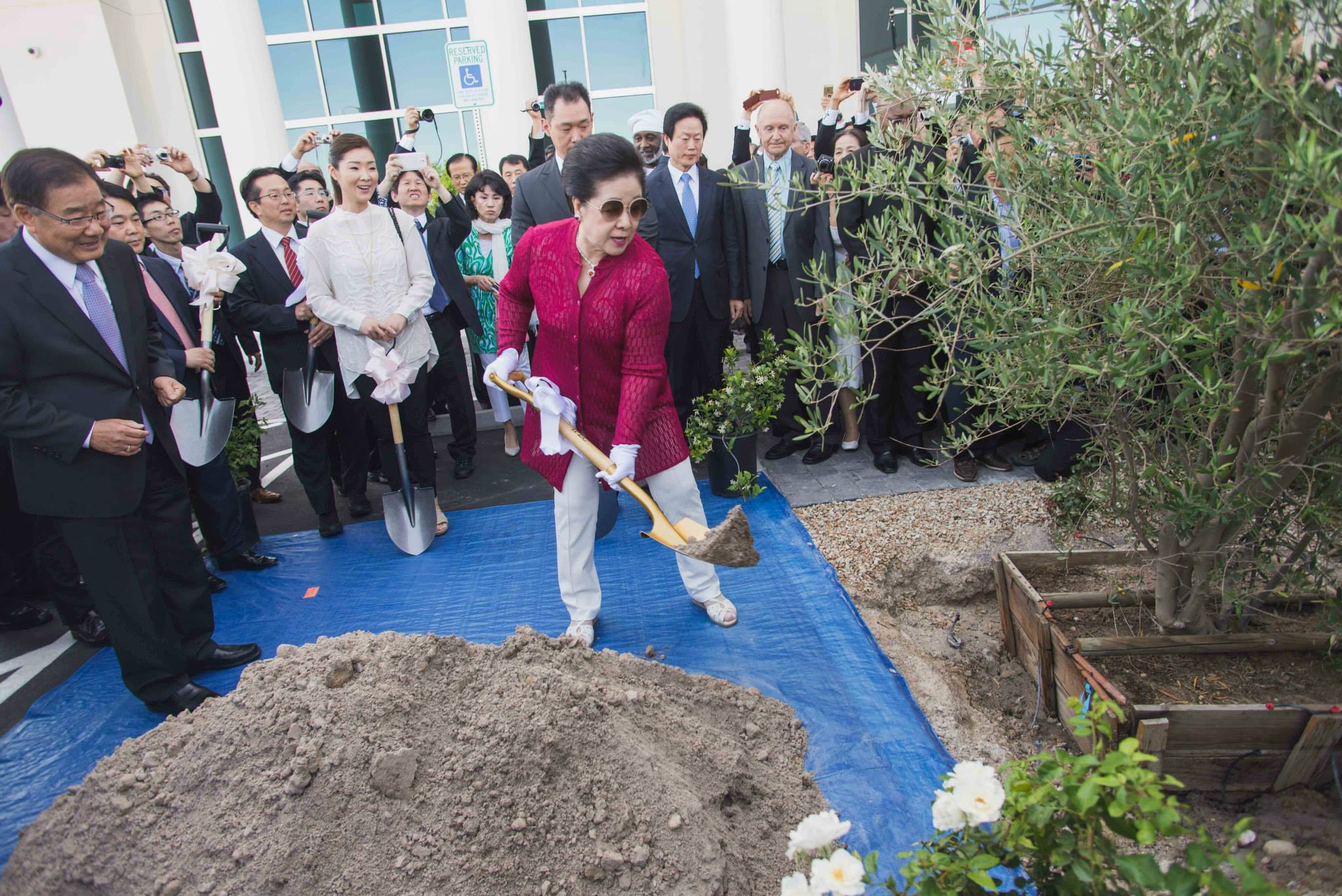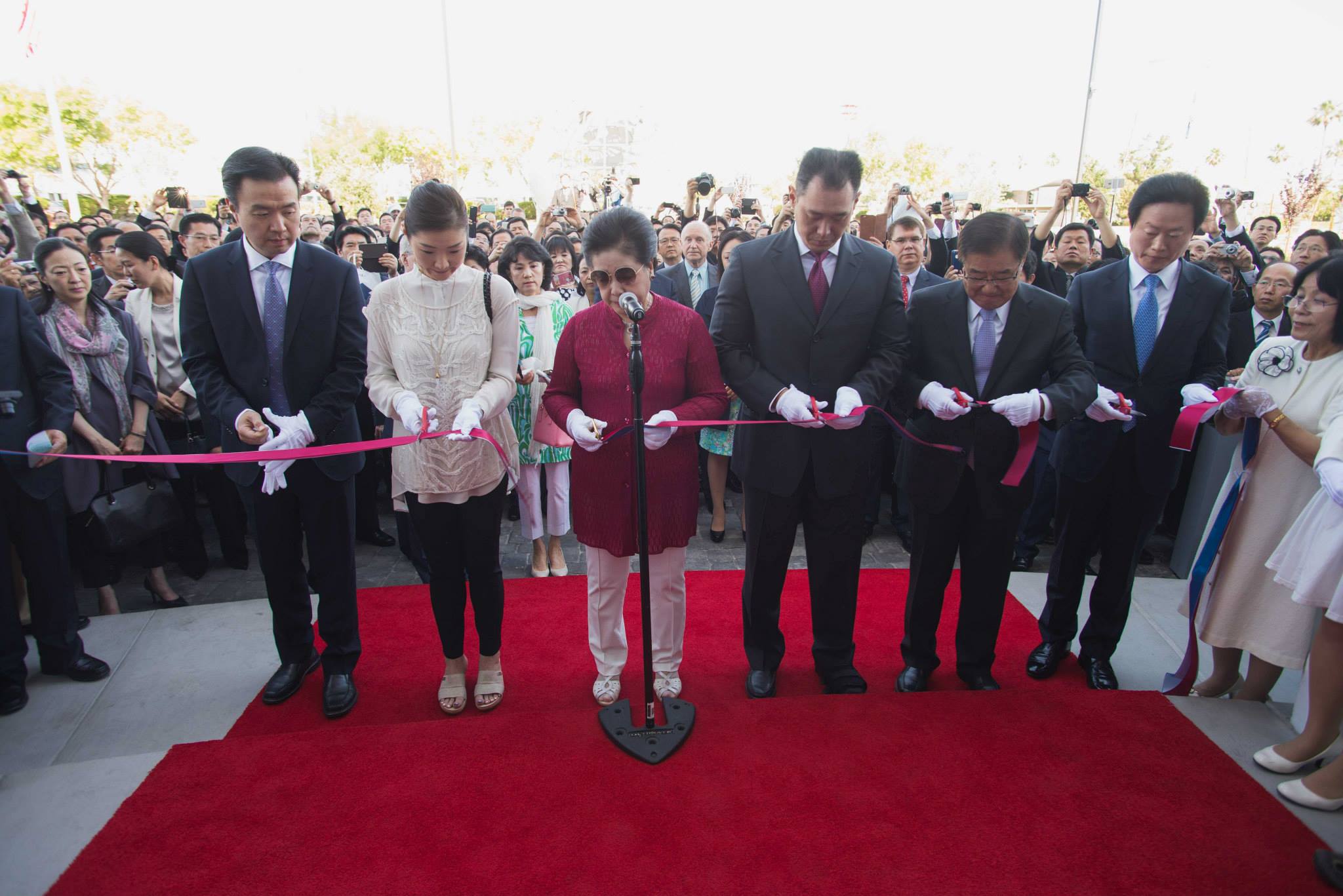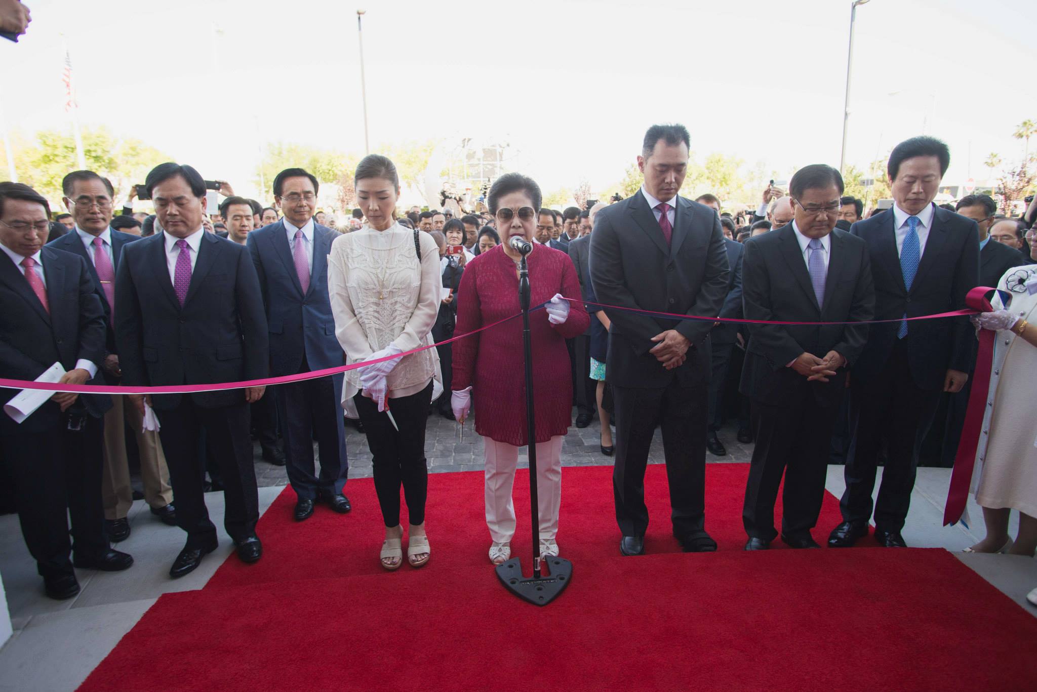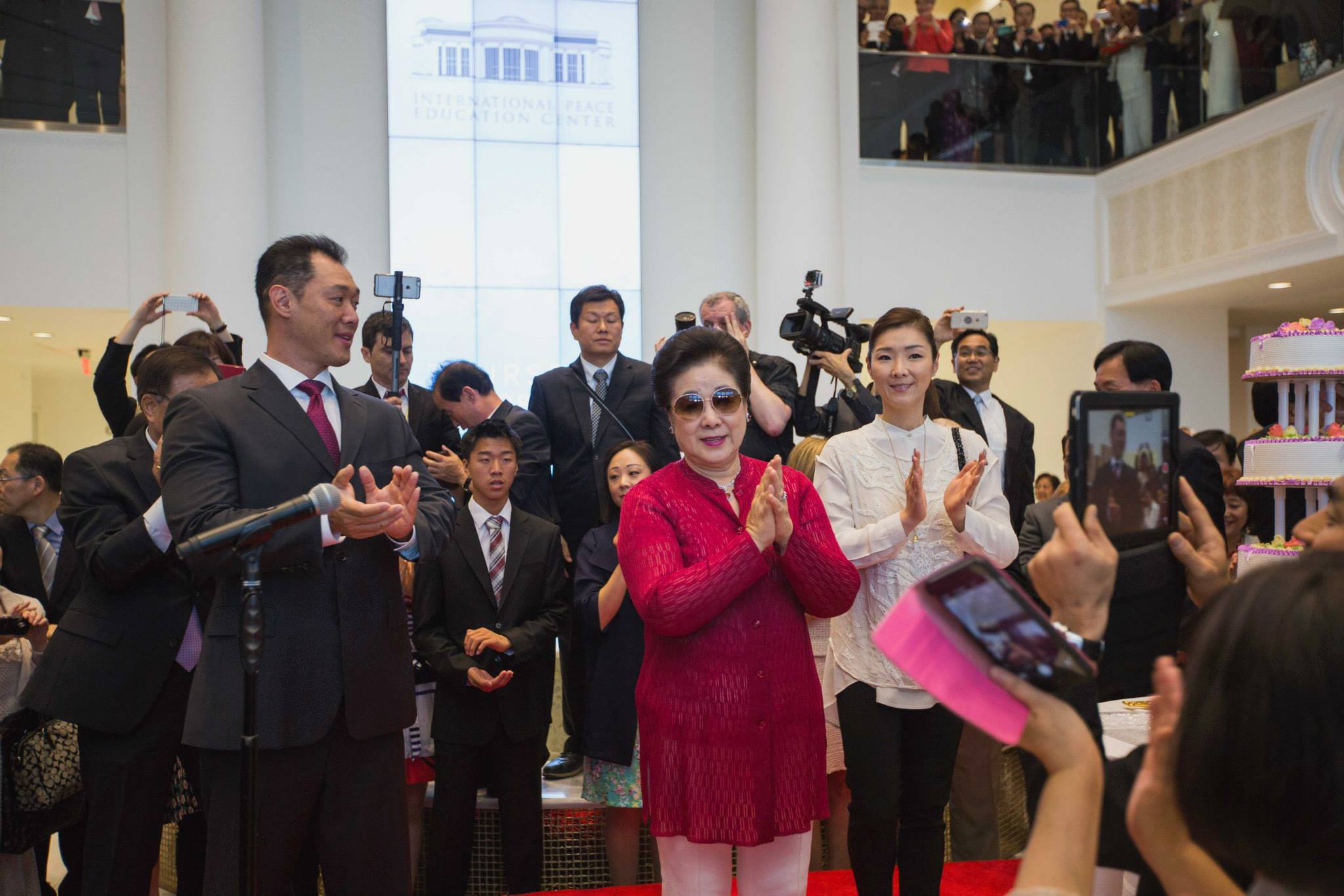 True Mother gave a tearful prayer, asking our Heavenly Parent for forgiveness for not being able to do more and do it faster. Following the prayer, there was a ribbon-cutting, and everyone entered the peace center with True Mother. Her demeanor was of complete seriousness over the occasion. As she went from room to room to bless the center, the crowd gathered in the main entrance hall to prepare the space for the ceremonial cake cutting and congratulatory song. Congressman Dan Burton and his wife were front and center. Sun Jin Moon, International President of the Family Federation for World Peace and Unification (FFWPU), In Sup Park, FFWPU International Vice President, Kwon Jin Moon and his wife Hwa Yun moon, Prof. Yeon Ah Moon, and her children were all in attendance.