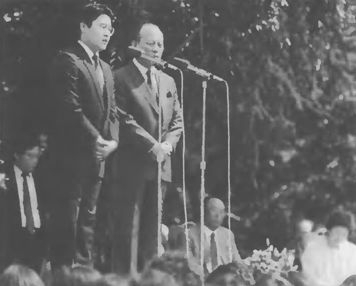 First of all, I feel really inadequate to be standing here and addressing you, but at the same time I feel very honored and privileged. Ever since Father came to America in 1973, you and I have been with True Parents and we have shared a lot of experiences. As we commemorate this first anniversary of Father's return from Danbury, we have unforgettable memories to sustain us. Many things pass through my mind, and I would like to share some of them with you.