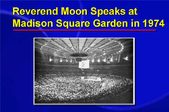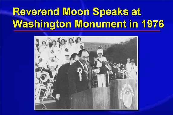 To inspire America to avoid the same mistakes, to inspire America to sacrifice herself for the sake of the world, to inspire America to work towards "One World Under God," God summoned Reverend Moon to his country to proclaim God's new revelation. And in particular, God called me to lead the young people of America, the leaders of tomorrow, back to God.