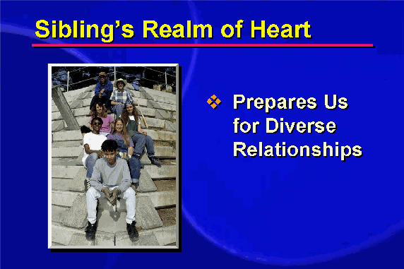 In the siblings' realm of heart, love becomes more reciprocal, as children learn to give as well as receive. Like all relationships, it takes effort to develop deep bonds of heart with our brothers and sisters.