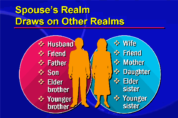 Each realm includes both a role and a norm. These norms include the responsibilities, attitudes and virtues associated with each realm. Each culture has norms for the perfect wife, the model child, the exemplary father, and so on. Details may differ from culture to culture, yet beneath the diversity lies a common denominator of caring. And in all cultures, the family matrix prepares people for wider roles in society.