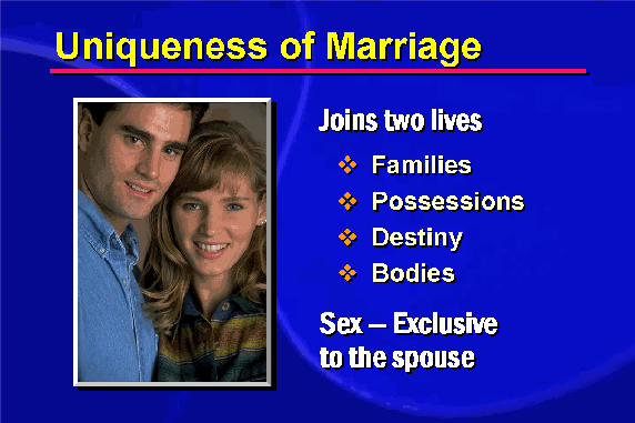 In the marriage vows, a man and a woman entrust themselves completely to each other. The sexual bond between husband and wife is the physical expression of two mature lovers joining into one in total openness and trust, with nothing standing between them. The profundity of the marital union on both the physical and emotional planes means it can occur meaningfully with one and only one person.