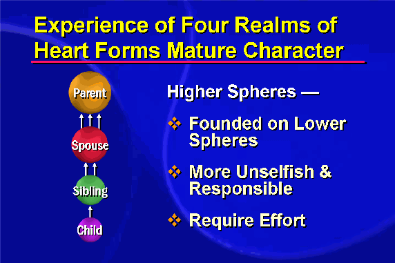 Each realm supports and participates in the next, while each successive realm requires a greater degree of responsibility and unselfishness than the one before. Success in each realm is determined by the degree to which values of the preceding realms are embodied. Our capacity to love increases as we learn to overcome self-centered desires and develop our ability to live for the sake of others. Ultimately, we seek to possess a genuine heart of love and stand as a true parent.