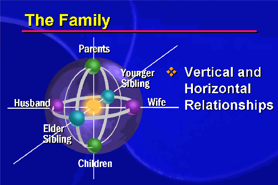 The vertical axis represents the sequence of generations: grandparents, parents, children and grandchildren. These are vertical relationships. There are two horizontal axes, one representing relationships among elder and younger siblings, and the other representing the relationship between husband and wife. Marriage is a unique and exclusive relationship, not meant to be shared with anyone else. Relationships on the husband/ wife axis are complementary and equal.