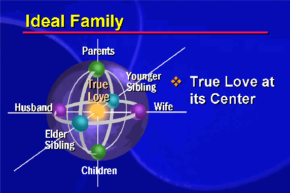 With true love in the center, people in all six positions -- parents, children, elder sibling, younger sibling, husband and wife -- live for their counterparts. Equality in the family is realized as each person receives the optimal love according to his or her role in the family.