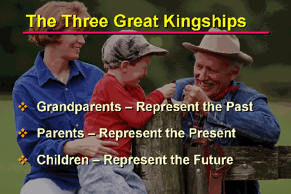 Within the family, that sense of nobility should ideally be maintained through the respect, dignity and, most of all, the unconditional love of the parents. Reverend Moon expresses that idea in his concept of the Three Great Kingships in which past, present and future rulers are represented by the grandparents, parents and children respectively.