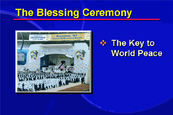 The Blessing ceremonies conducted by Reverend and Mrs. Moon are intended to restore the mistakes of the past, address the social problems of the present and hasten the realization of God's ideal of creation. They lie at the very core of his plan to realize world peace.