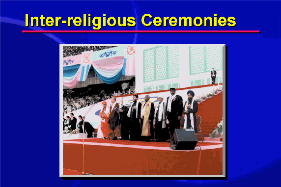 The Blessing ceremonies are inter-religious events, at which leaders of the world's faiths join in prayers over the marriages. They are also interracial and intercultural events, where representatives of different races are joined together in marriage. Thus they are, in a very real sense, global events, uniting the world in a new vision of peace: the family of humankind.