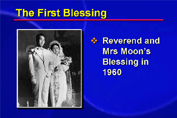 The first Blessing was that of Sun Myung Moon and Hak Ja Han on April 13, 1960.