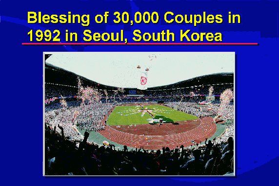 In all, 30,000 couples from 131 countries participated in the Blessing ceremony at Seoul Olympic Stadium on August 25, 1992. For the 20,000 couples present at the event, the stadium was their chapel.