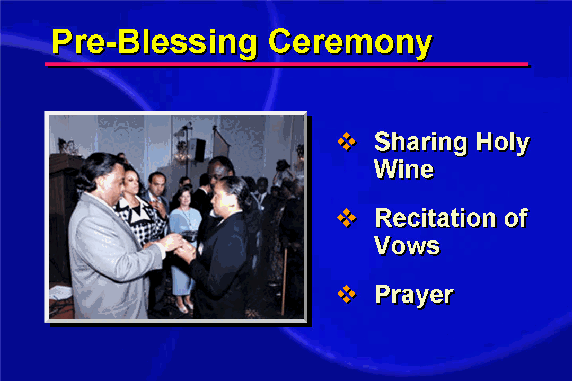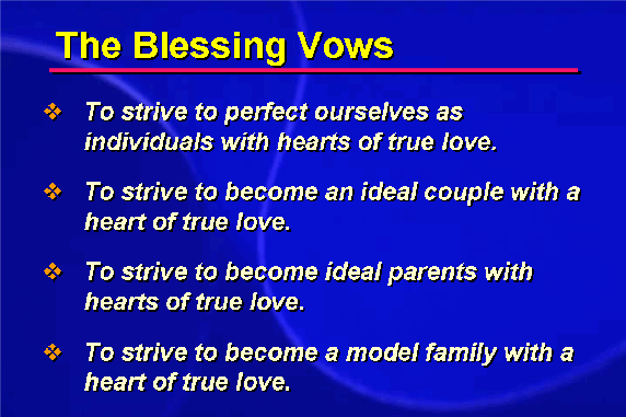 Finally, the officiator offers a prayer and proclaims the participants husband and wife standing within the realm of God's original and eternal Blessing. In the many Blessing ceremonies conducted around the world, couples have recited vows such as the following: